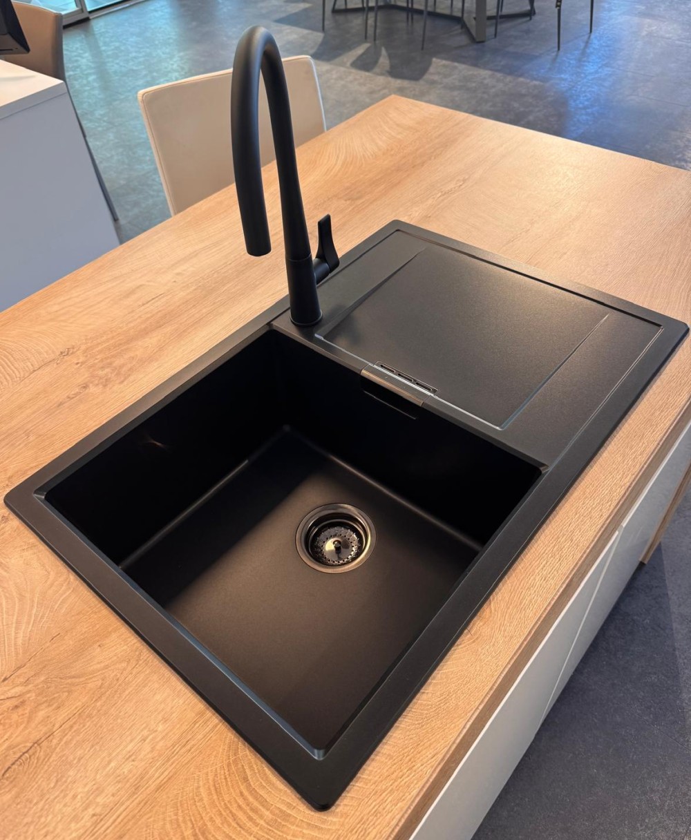 Kuhinjska armatura SCHOCK Gota v črni barvi Black z ekstra visokim izlivom je prava paša za oči. Njenemu elegantnemu dizajnu se lepo poda pomivalno korito SCHOCK Mono N-100 ali Kallio M-175.