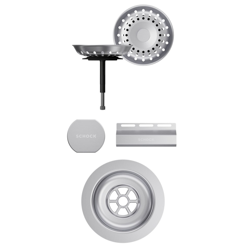 Vsako korito SCHOCK iz linije Cristadur® lahko opremite s setom izliv, preliv in gumb v petih barvah: srebrni (EDM), belo-zlati (White Gold), brušeni bakreni (Copper), brušeni temno sivi (Gunmetal) ter črni (Puro).