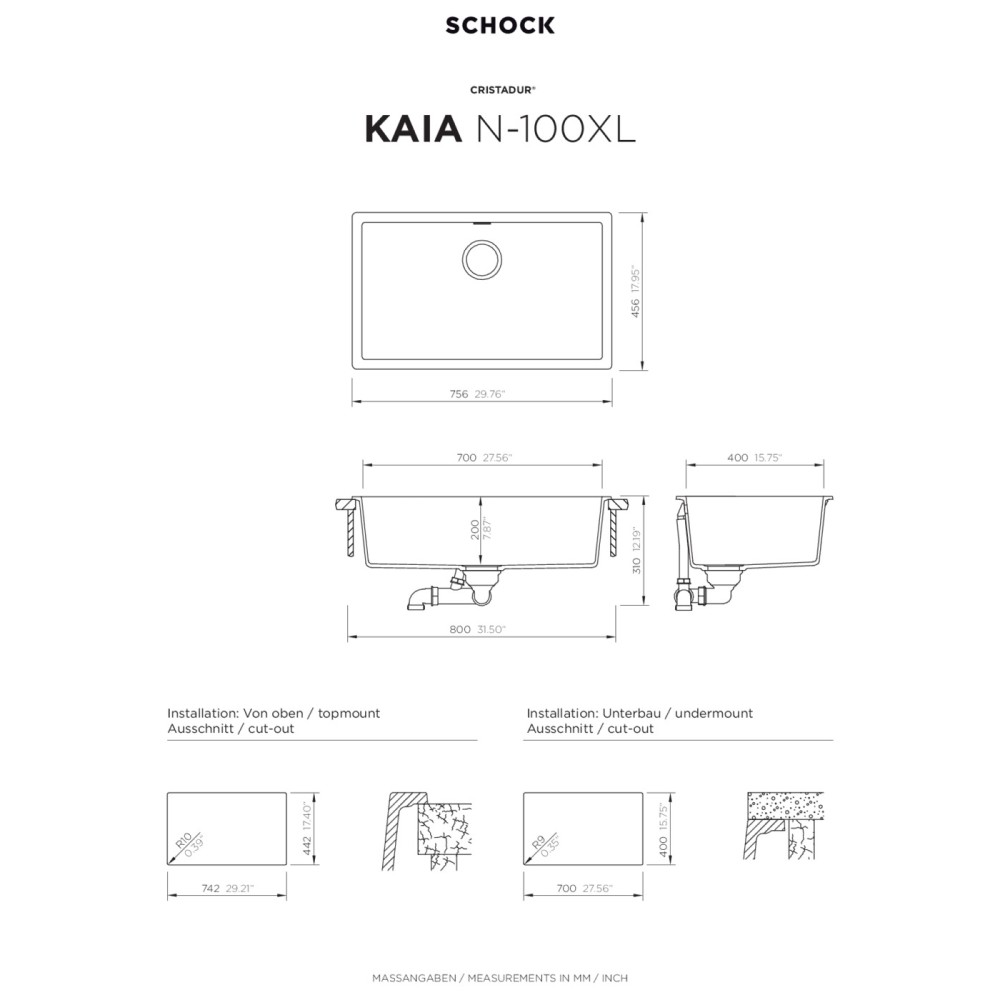 Korito se lahko namesti na vsadni (KAIN100XLA), podvgradni (KAIN100XLU) ali ploskovno-vsadni (KAIN100XLFB) način brez dodatnih CNC obdelav.